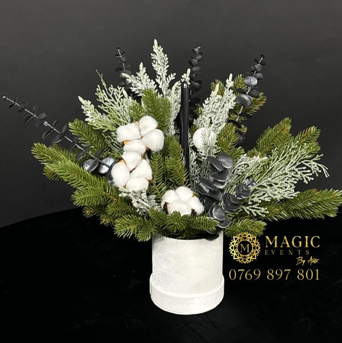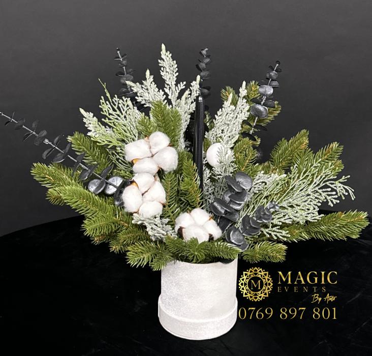 Baza aranjamentului este formata dintr-o cutie de catifea alba perlata, ce este atent decorata cu crengute de brad de mai multe feluri, flori de bumbac, globuri cu sclipici negre, eucalipt negru metalic si mici accesorii in nuante de alb si negru.