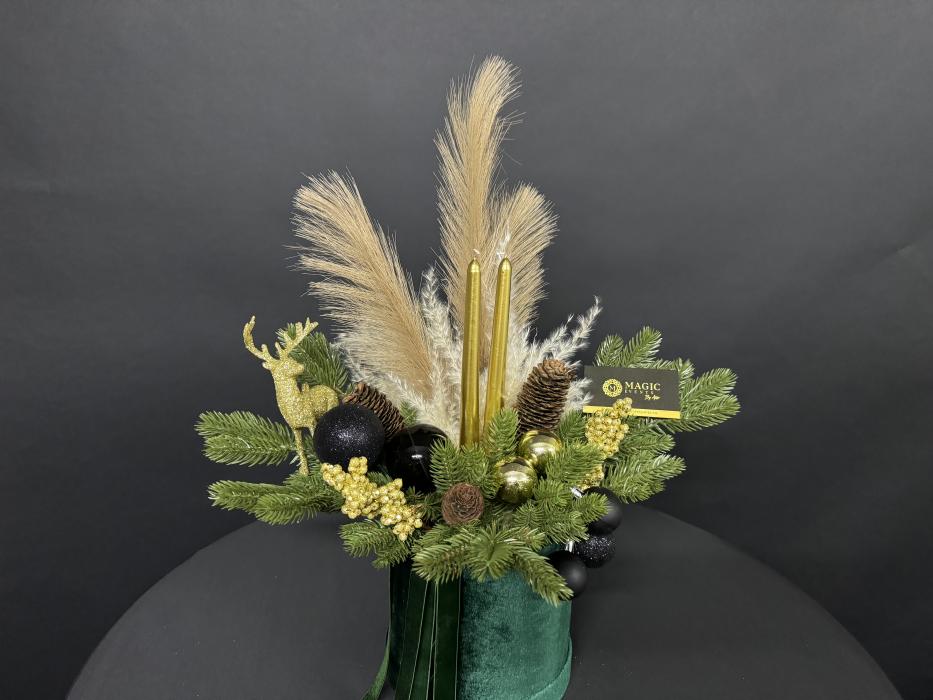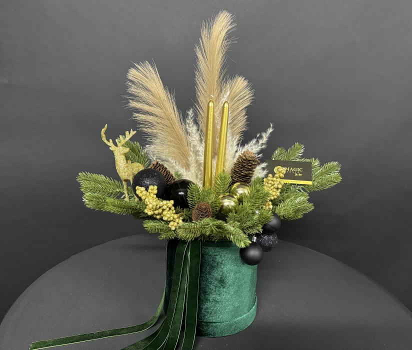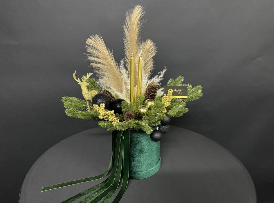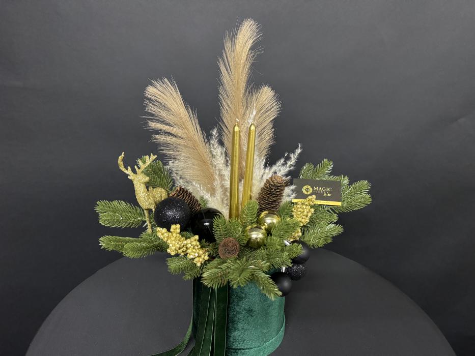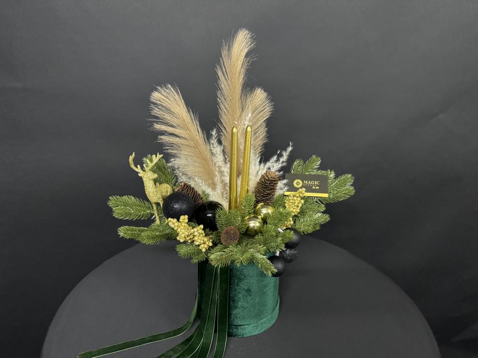 Baza aranjamentului este formata dintr-o cutie de catifea verde smarald, ce este atent decorata cu crengute de brad de un verde intens, pampas, 2 lumanari aurii, cerb auriu, conuri de bard, globuri negre si alte mici accesorii aurii.