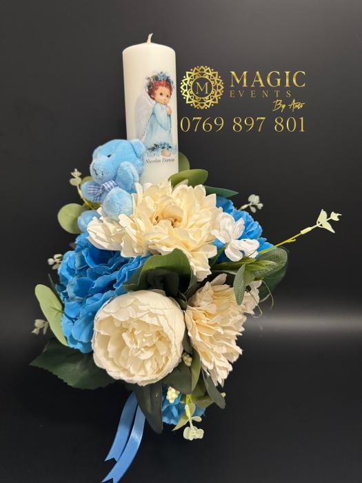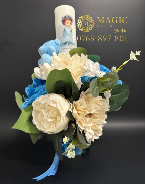 Lumanare de botez pentru baiat decorata in nuante de albastru intens si ivoire, culori ce se imbina armonios creand un cadru ce simbolizeaza puritatea si inocenta.