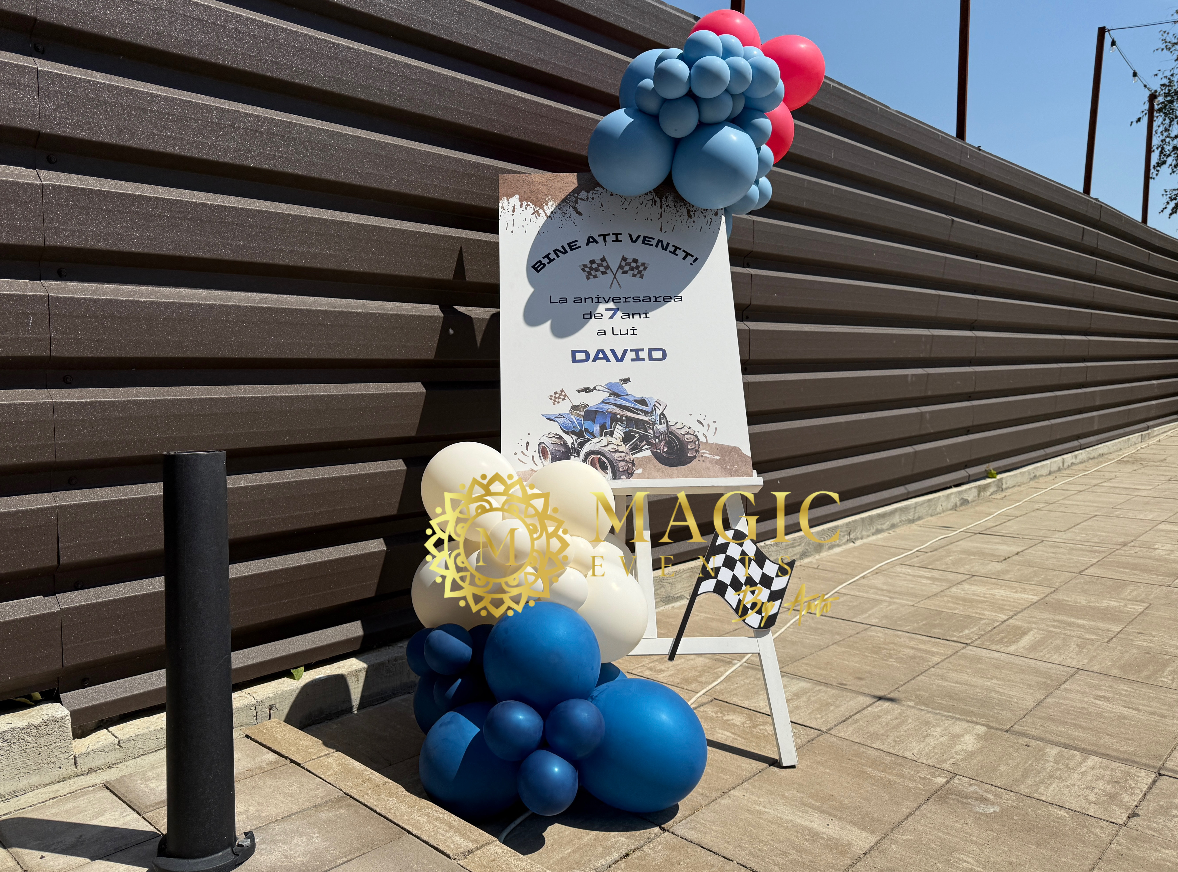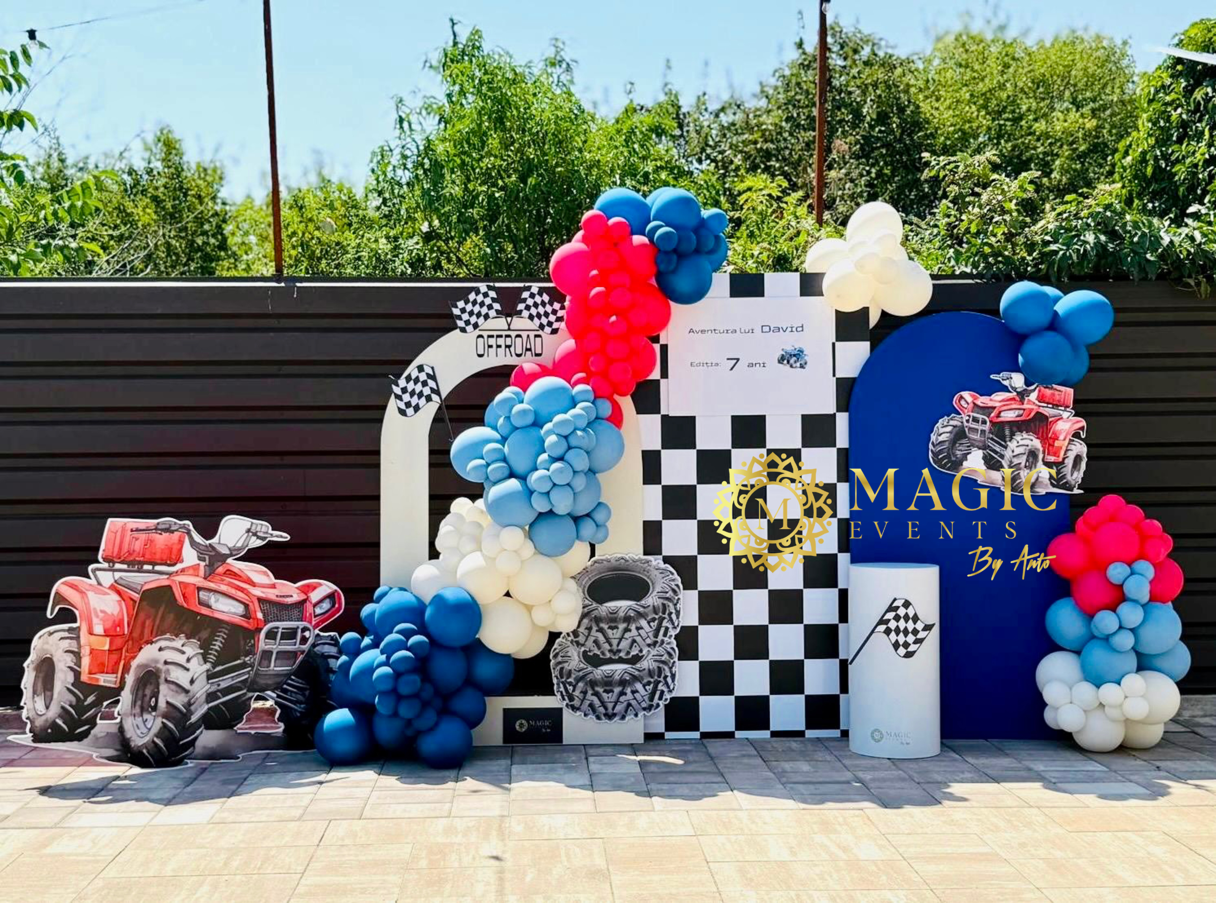 Decor spectaculos cu baloane colorate, stegulețe de curse și detalii personalizate, ideal pentru micii aventurieri pasionați de adrenalină!