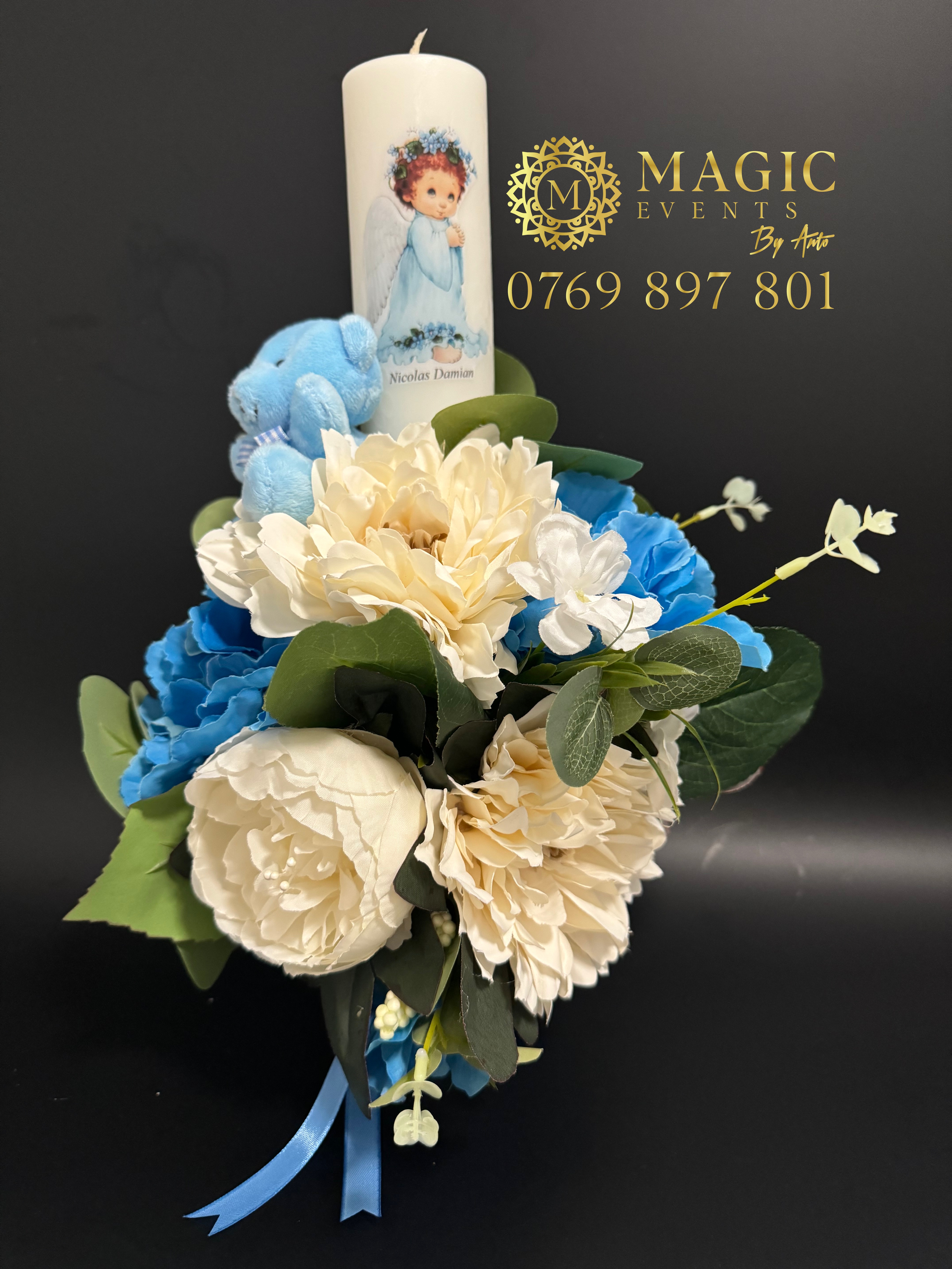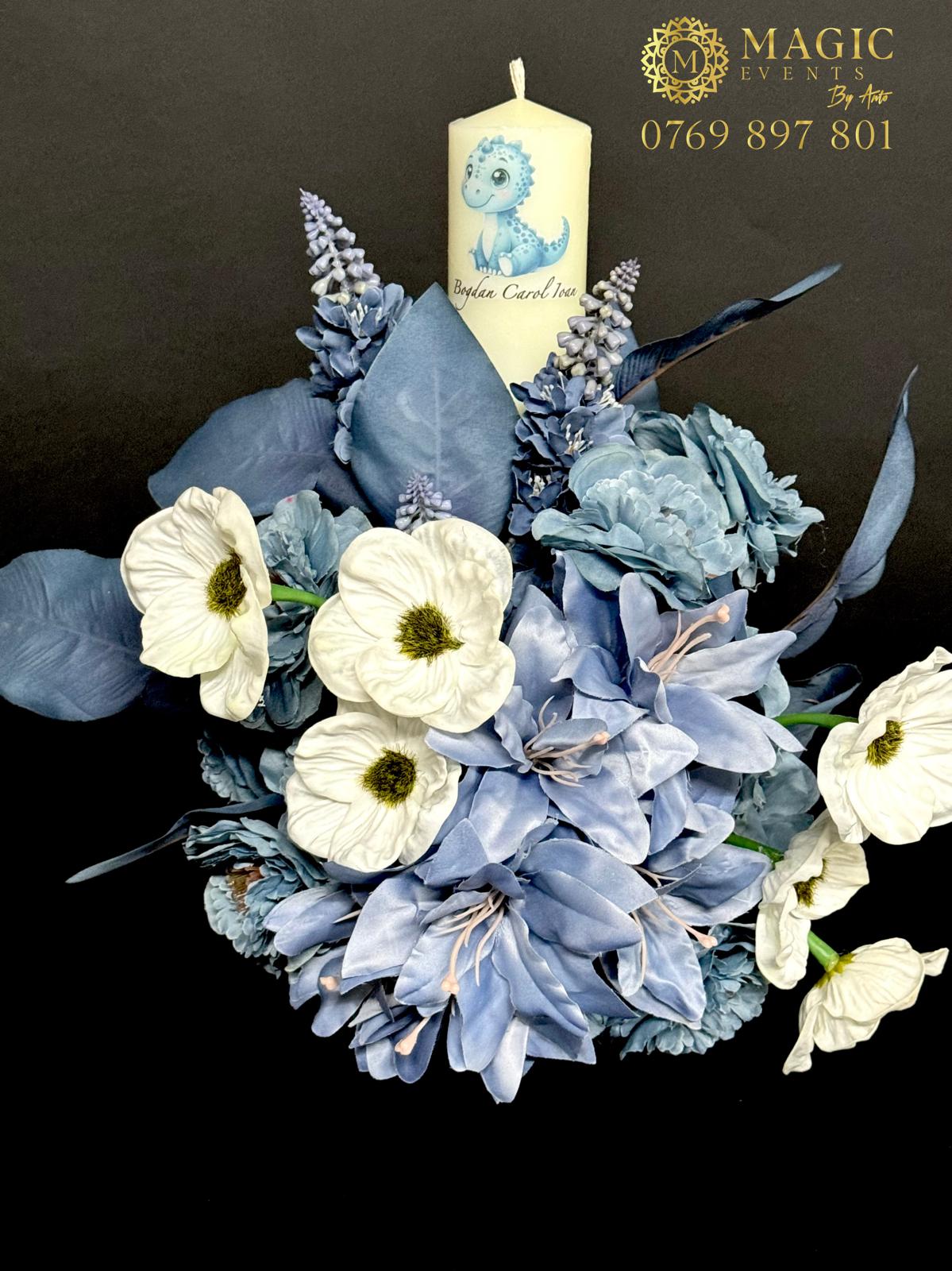 ca din povești, cu un dragonel simpatic și flori în tonuri de bleu și alb – pregătită să aducă zâmbete și magie la primul mare eveniment din viața micuțului!