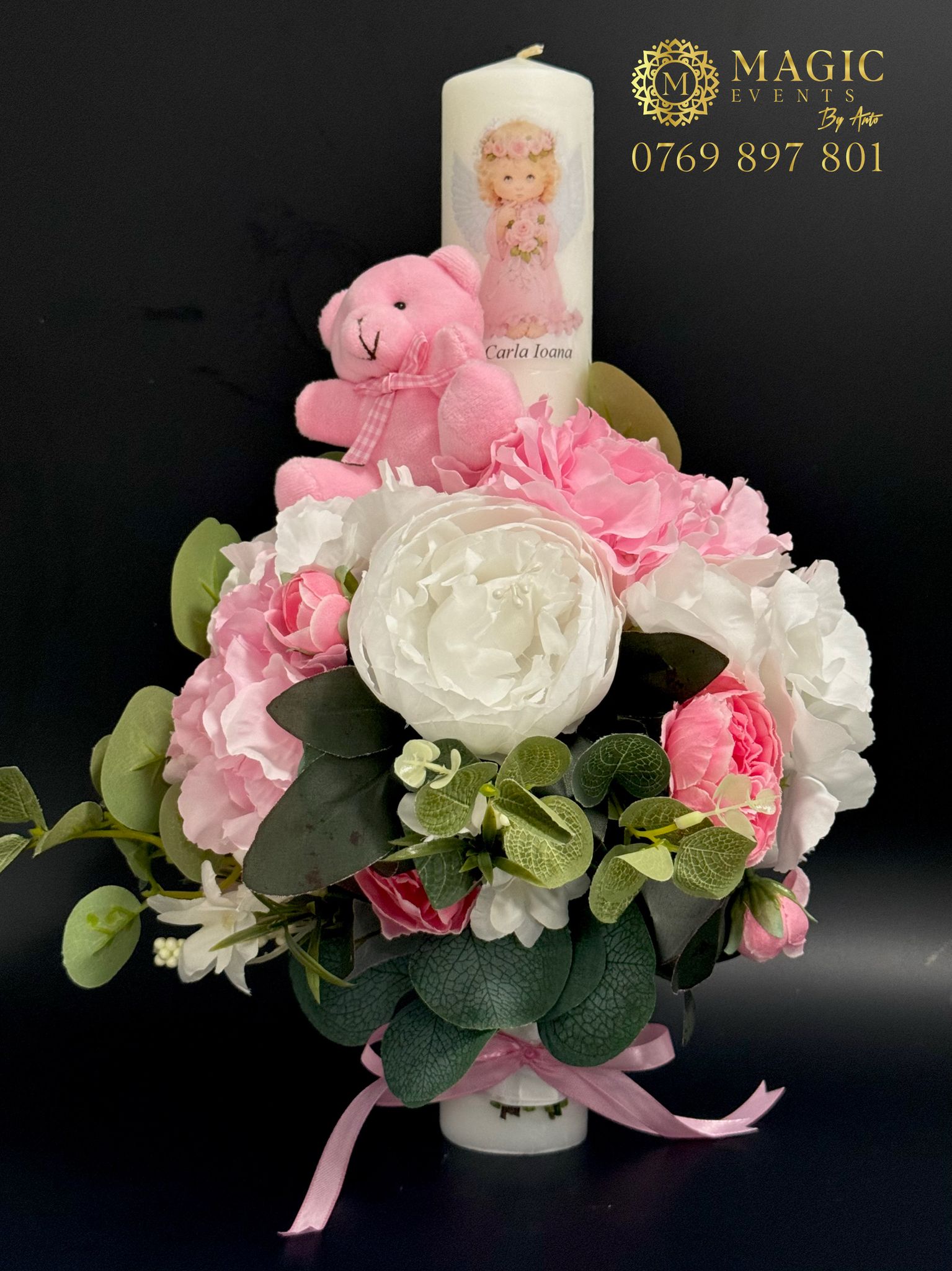 delicată și veselă, cu un îngeraș drăgălaș, flori roz și albe și un ursuleț adorabil – perfectă pentru o mică prințesă în ziua cea mare!
