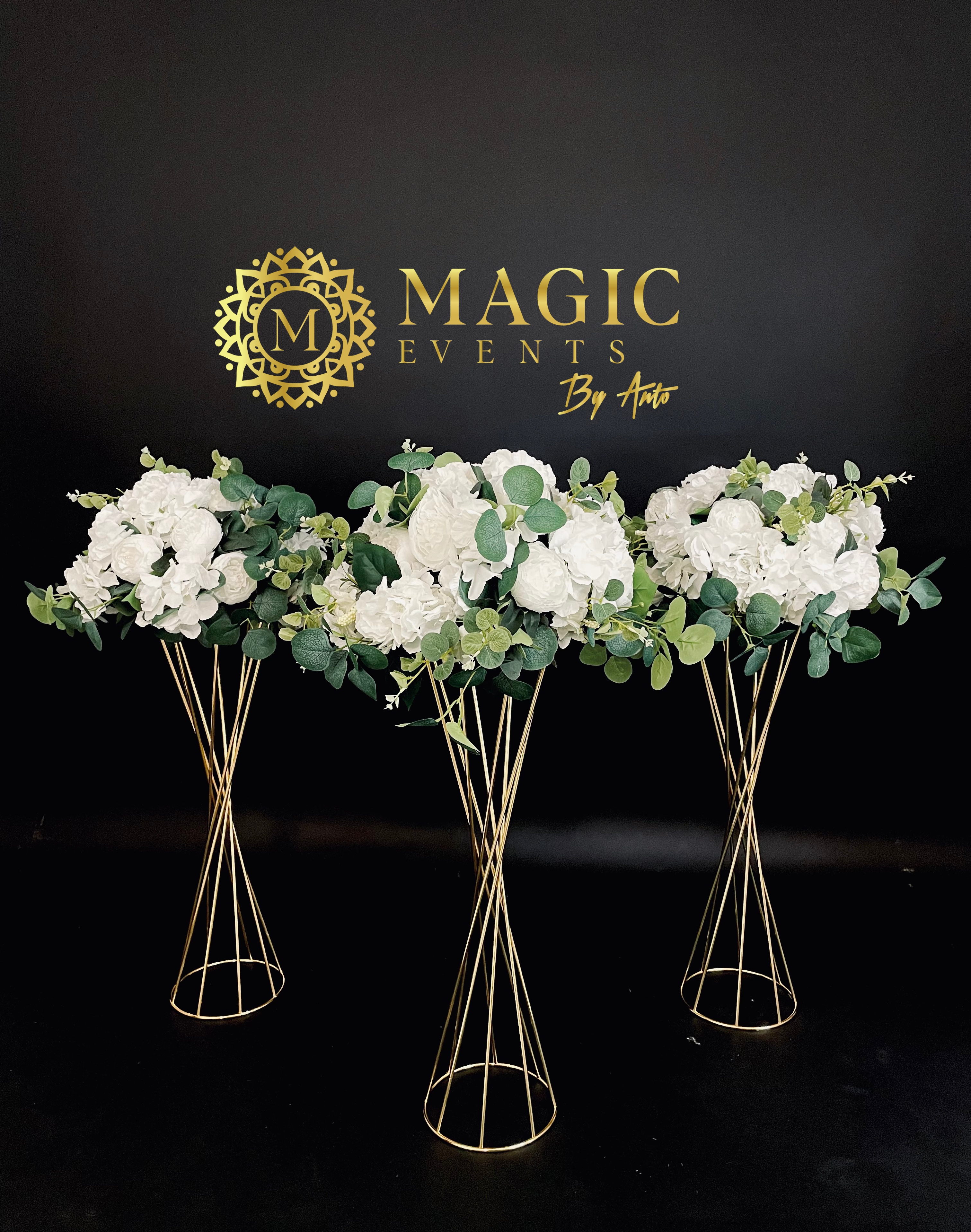 albe – un decor perfect pentru ceremonii, alei sau zone de impact vizual. Eleganța simplă a florilor albe și designul modern al suporturilor aduc un plus de stil fiecărui eveniment.