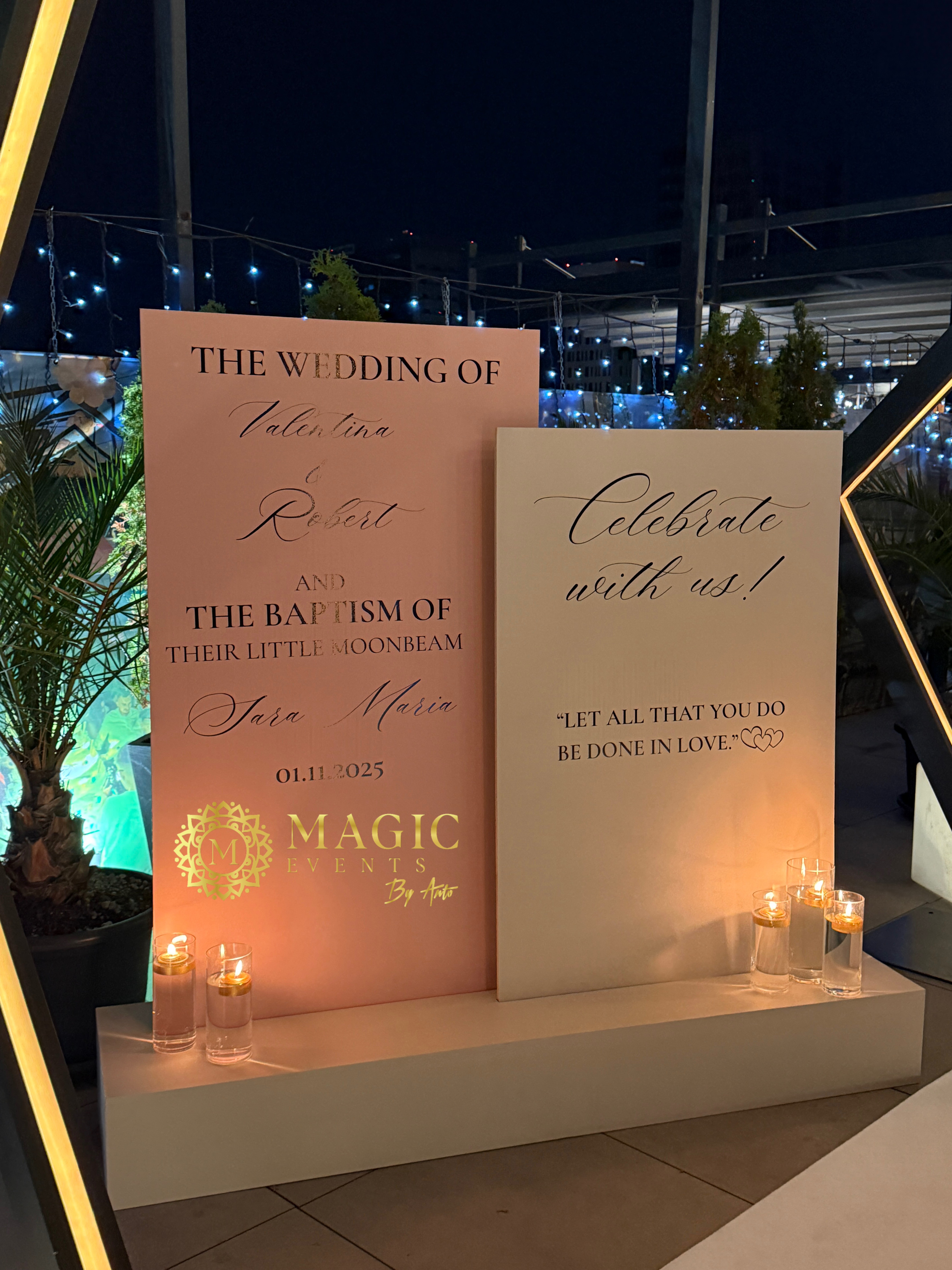 design elegant cu funde roz È™i lumânări aurii, creat pentru a ghida invitaÈ›ii într-un mod stilat È™i plin de rafinament!