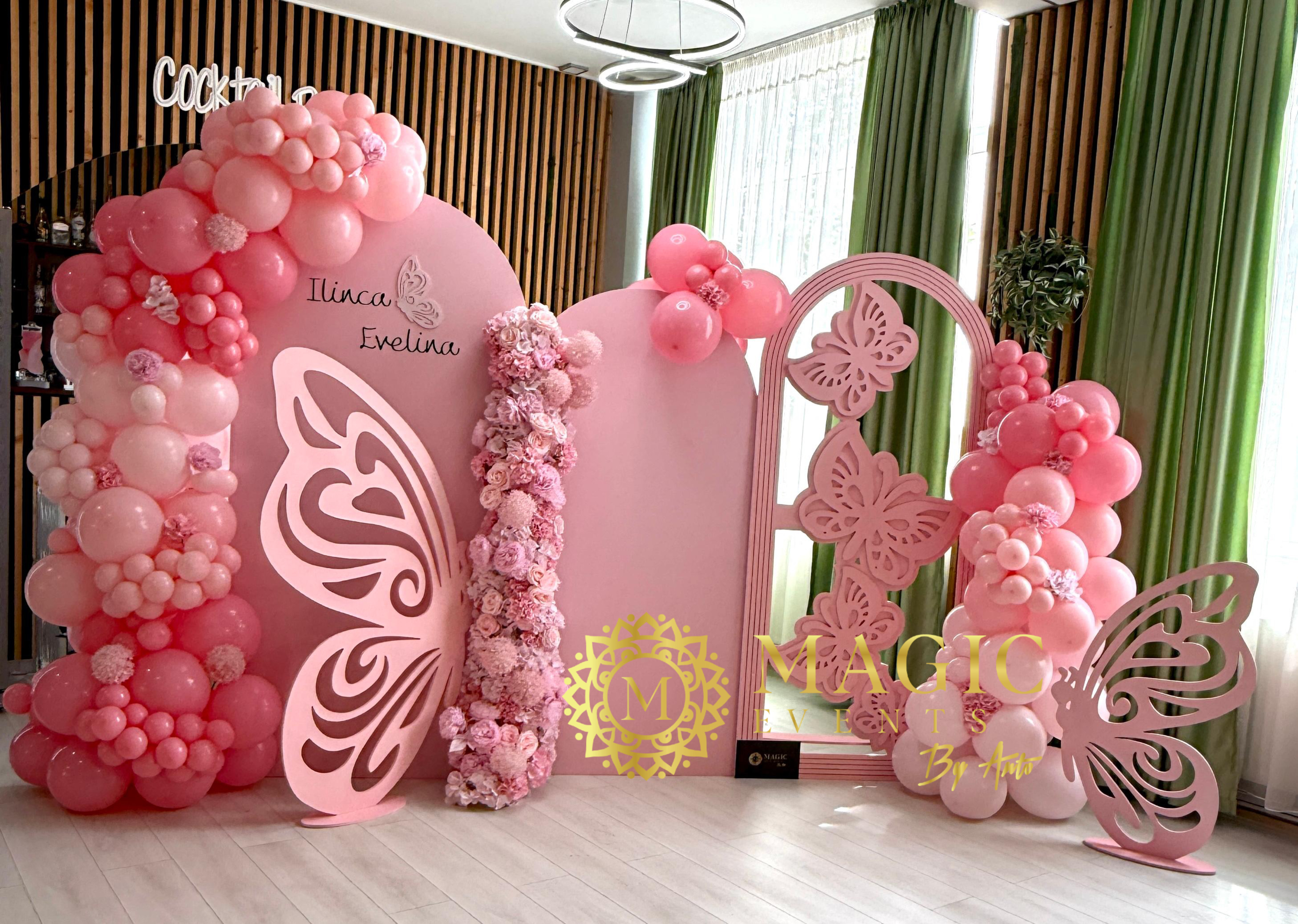 în nuanțe de roz, cu fluturi delicati, flori și baloane, perfect pentru o mică prințesă și amintiri pline de magie.