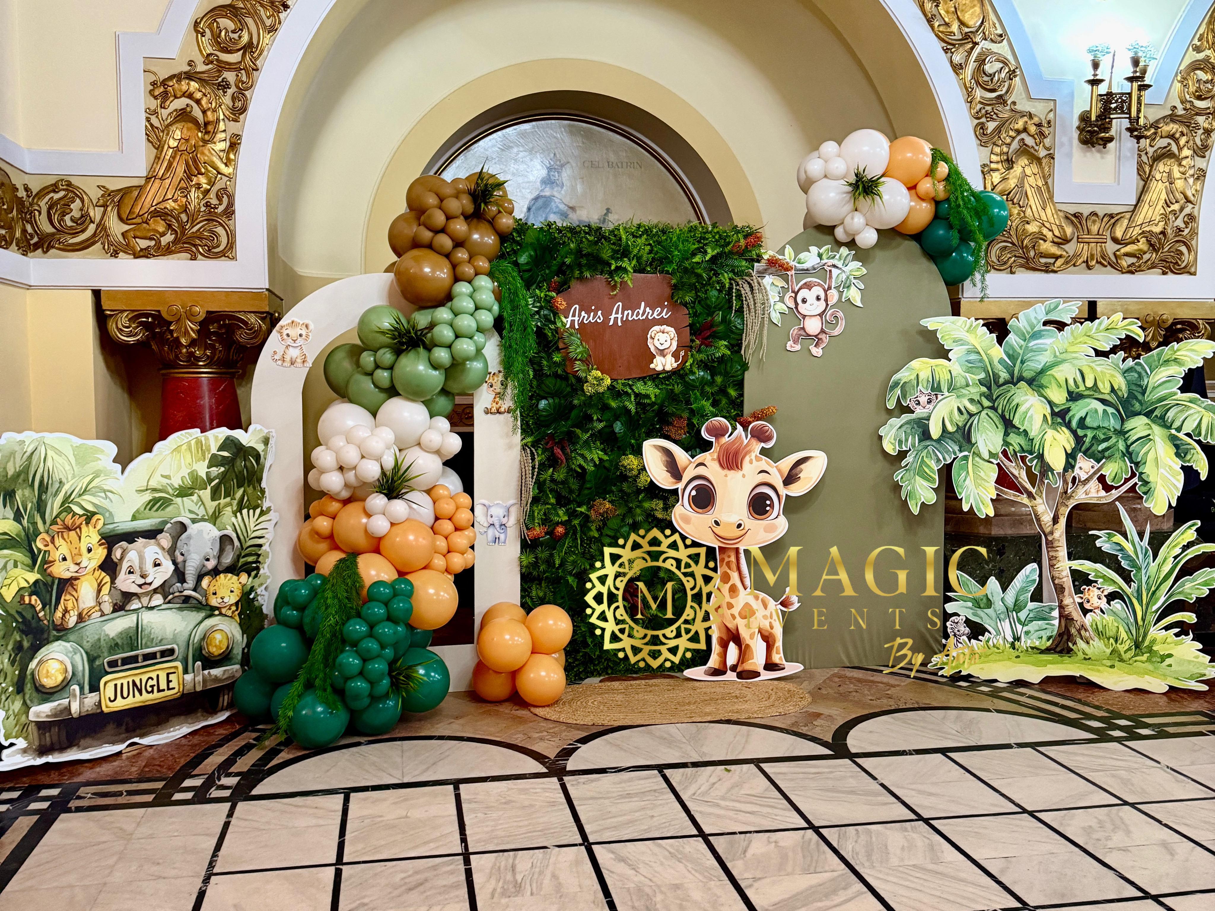 Decor colorat cu baloane verzi și portocalii, personaje simpatice și atmosferă de aventură tropicală, ideal pentru cei mici!