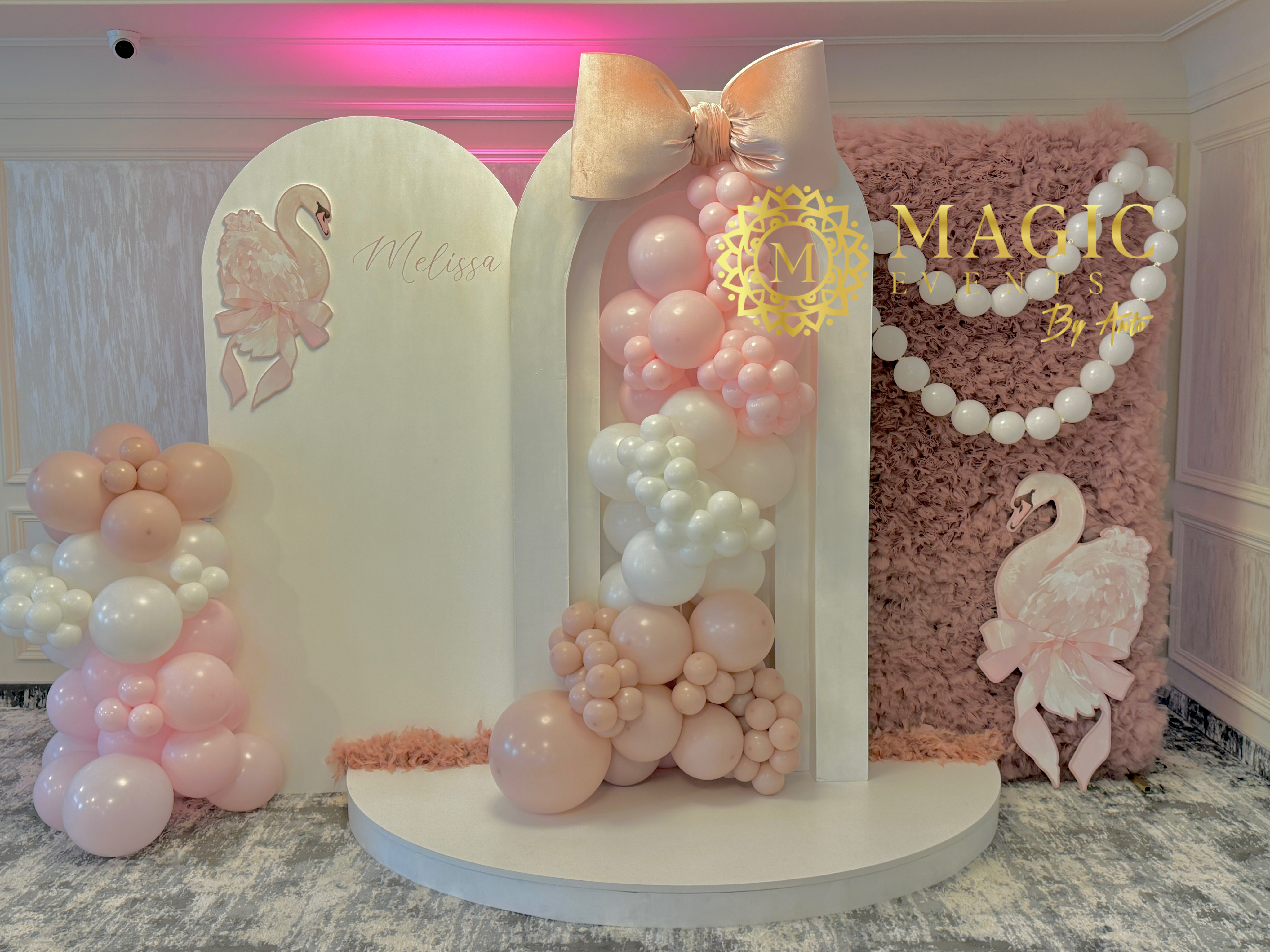 în nuanțe de roz, cu arcadă spectaculoasă de baloane, panou din tulle roz și detalii adorabile precum balerina, pantofiorii de dans și funda – ideal pentru un eveniment de neuitat!