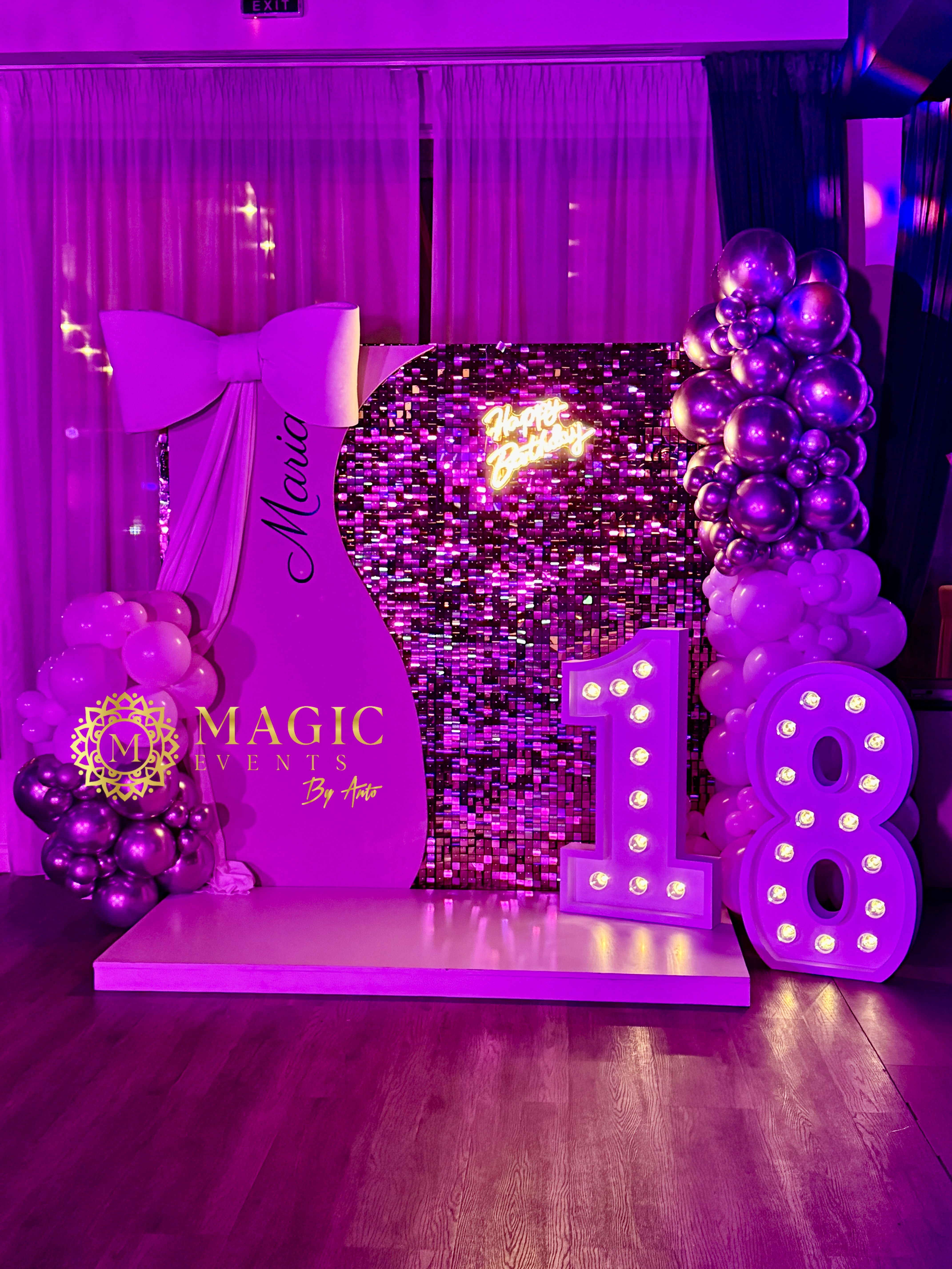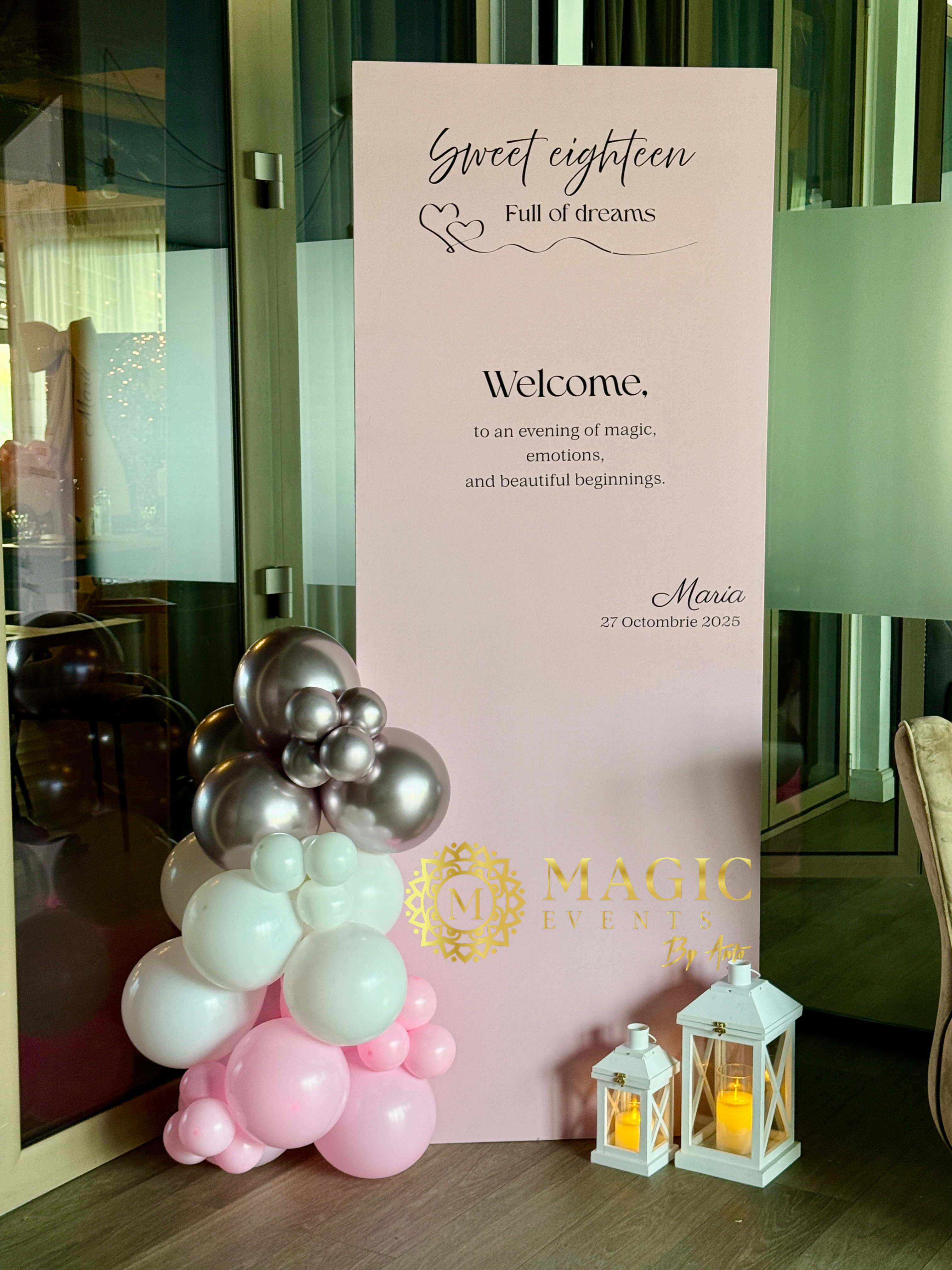 Ne ocupăm de organizarea completă È™i decorul personalizat al majoratului – de la conceptul tematic, grafică È™i invitaÈ›ii, până la decor cu baloane, aranjamente florale, candy bar, photo corner, lumini ambientale È™i multe alte detalii care fac diferenÈ›a.