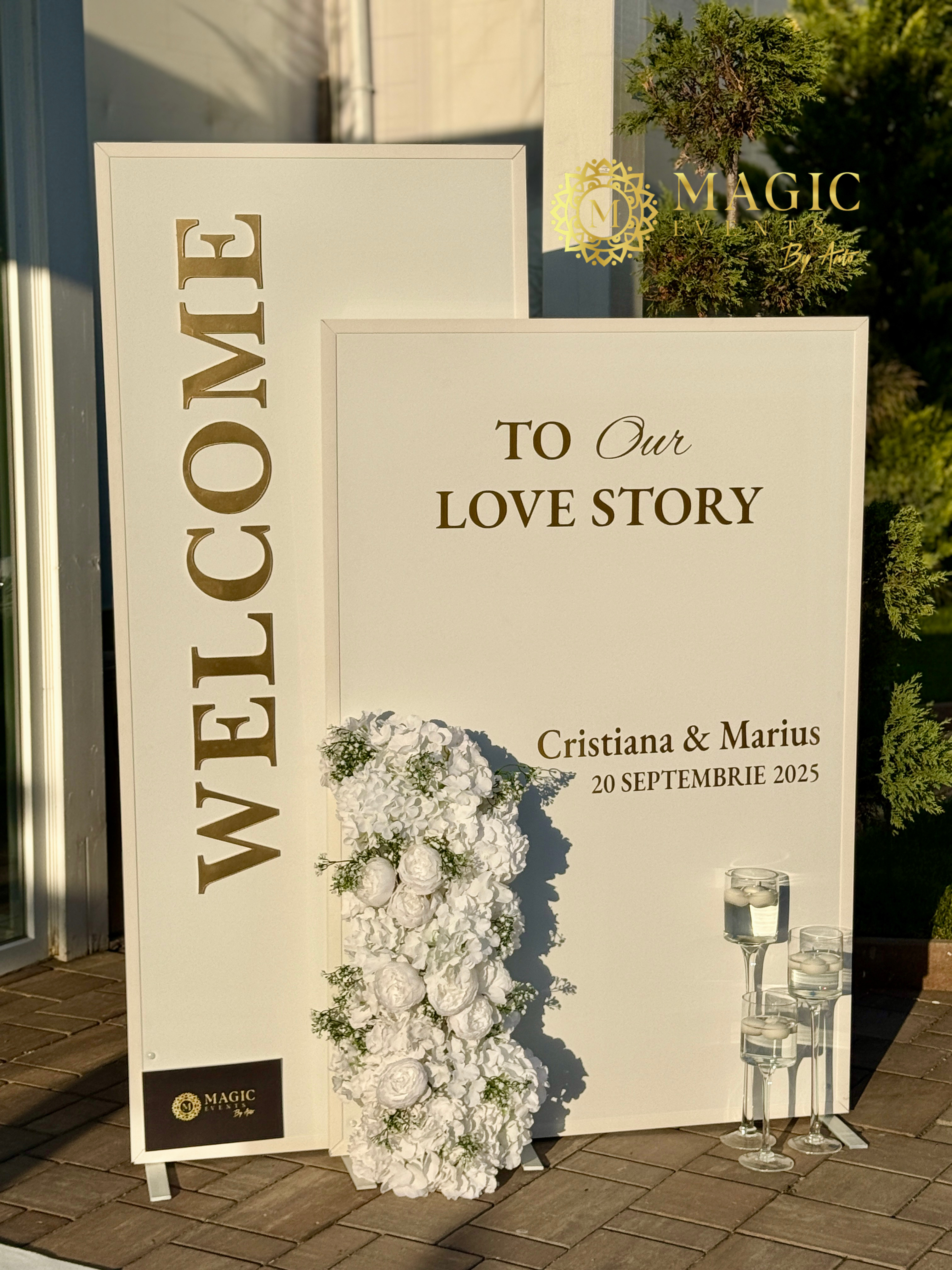 cu panouri albe personalizate, accente aurii È™i aranjament floral delicat — un welcome corner rafinat pentru începutul perfect al evenimentului.