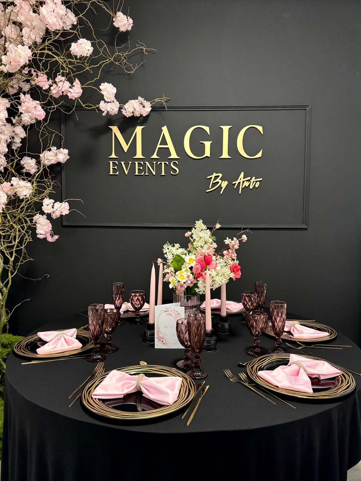 cu traversa roz pudrat și aranjamente din flori naturale, perfect pentru a oferii rafinament salii.