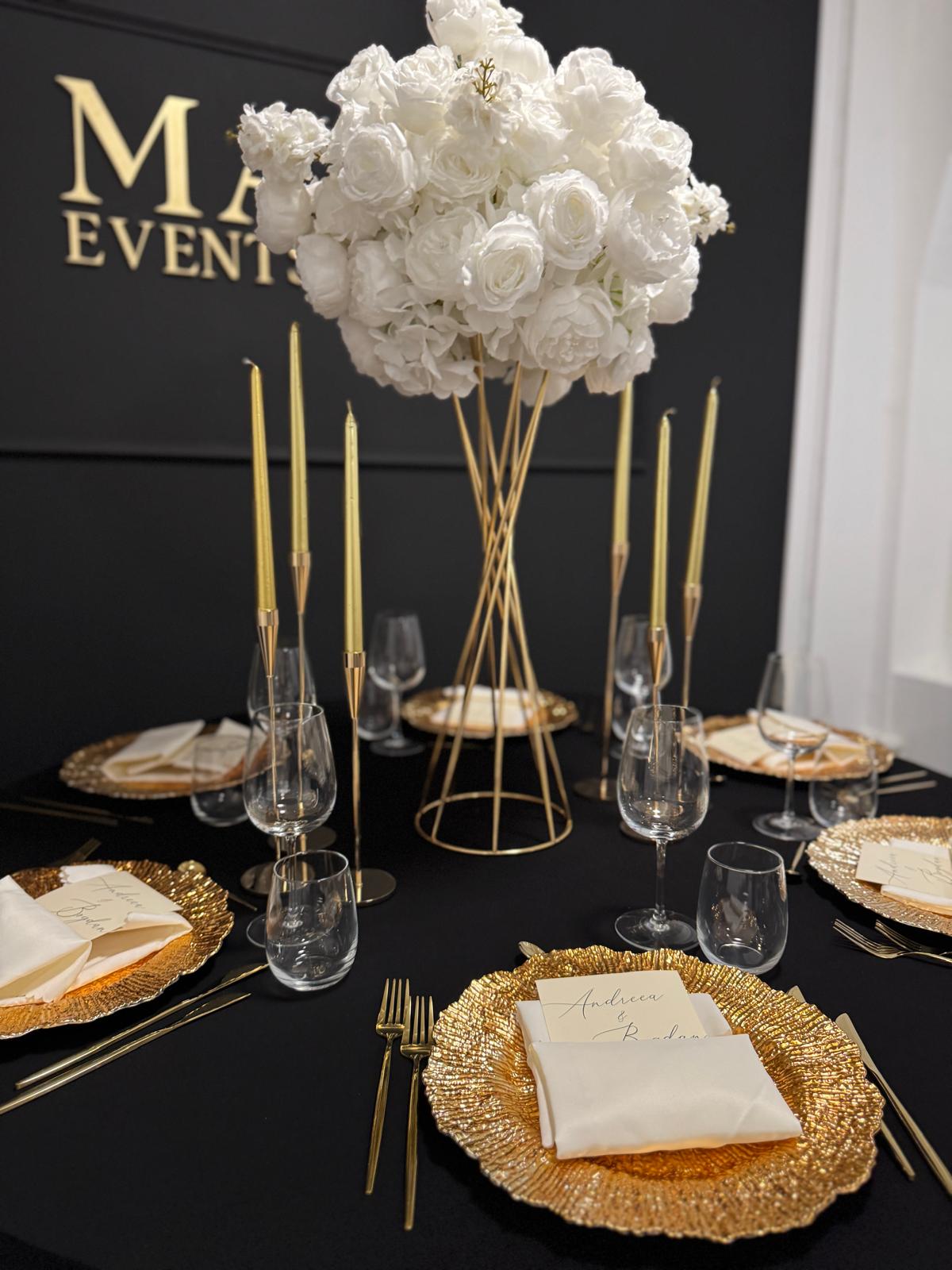 festivă cu aranjament floral alb, tacâmuri aurii și farfurii sofisticate texturate, perfectă pentru petreceri de lux.