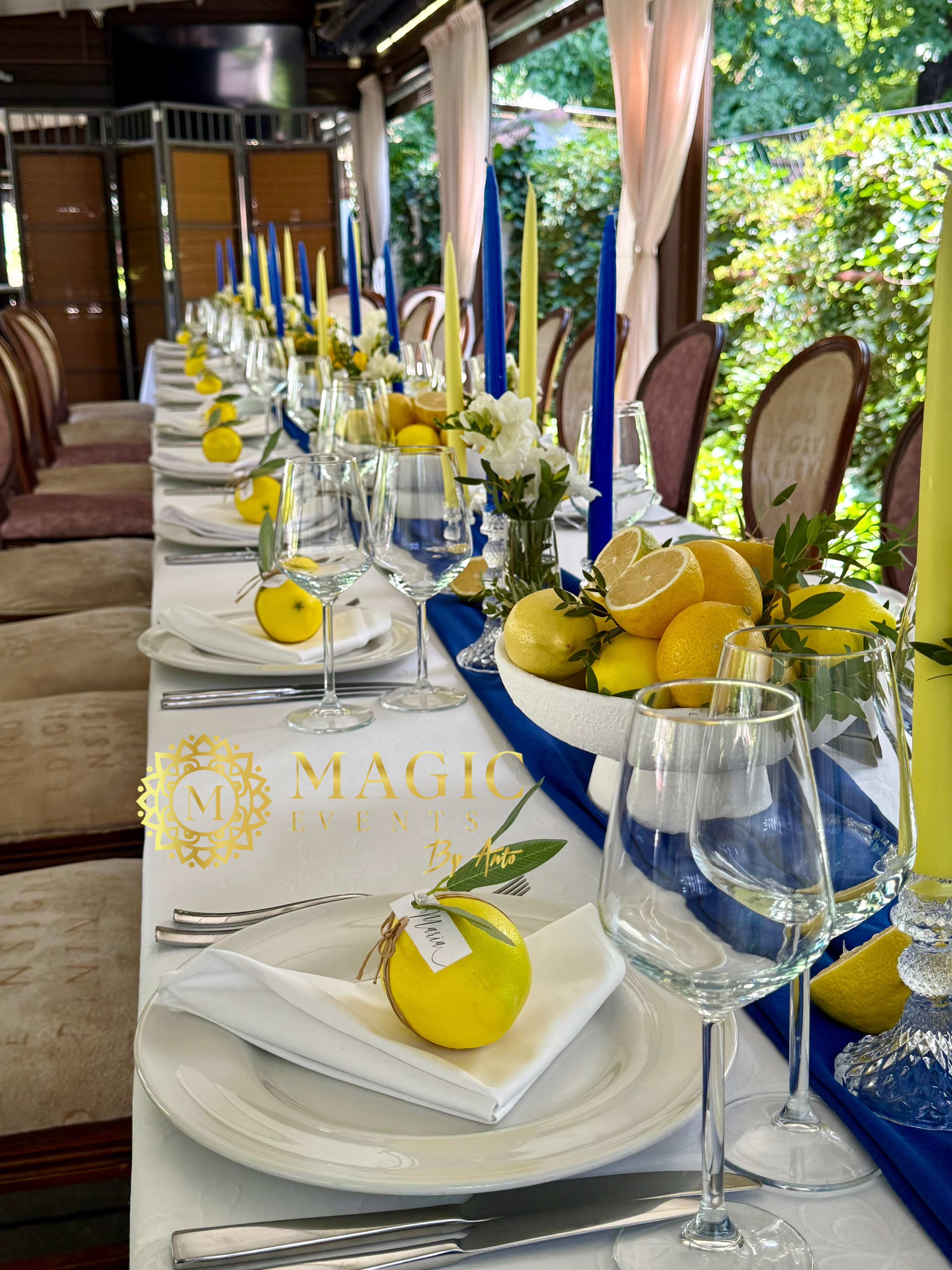 Lumânări albastre și galbene, lămâi proaspete și accente verzi – un aranjament vibrant, cu aer rafinat de vară.