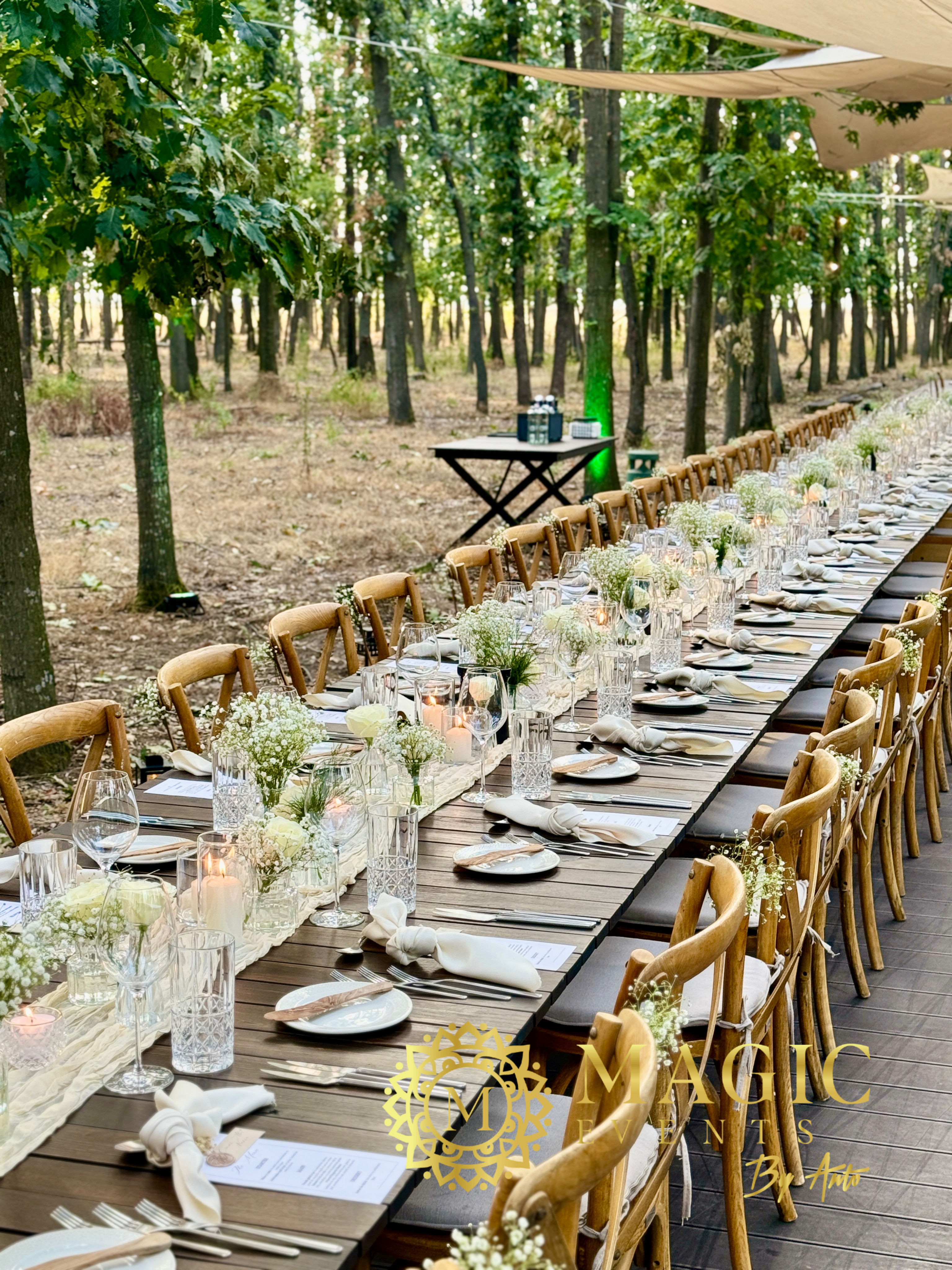 Eleganță naturală cu lumânări, verdeață și detalii fine, într-un cadru de poveste.
