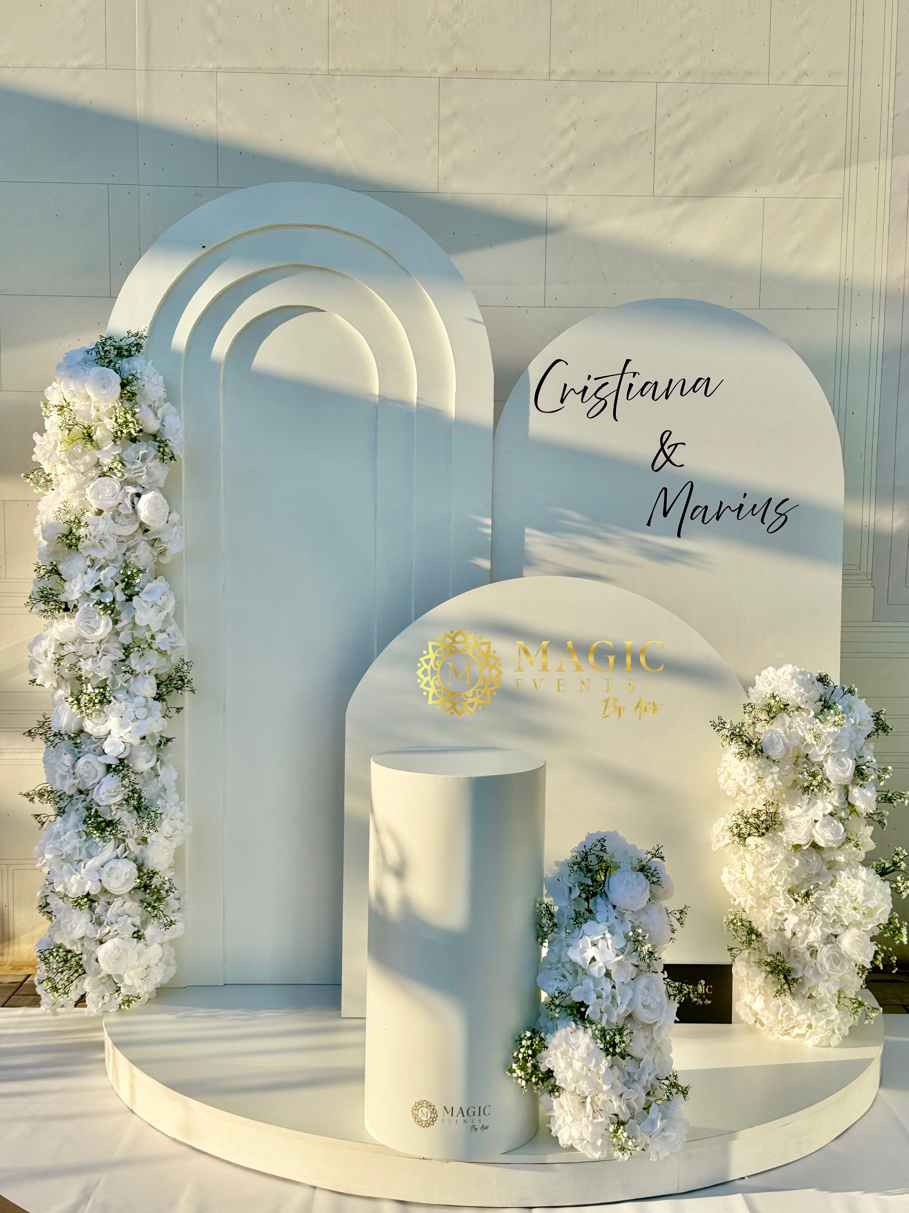 realizat din panouri arcuite în nuanÈ›e de alb È™i completat de aranjamente florale luxoase. Un decor elegant È™i luminos, ideal pentru un cadru plin de rafinament È™i momente fotografice memorabile.