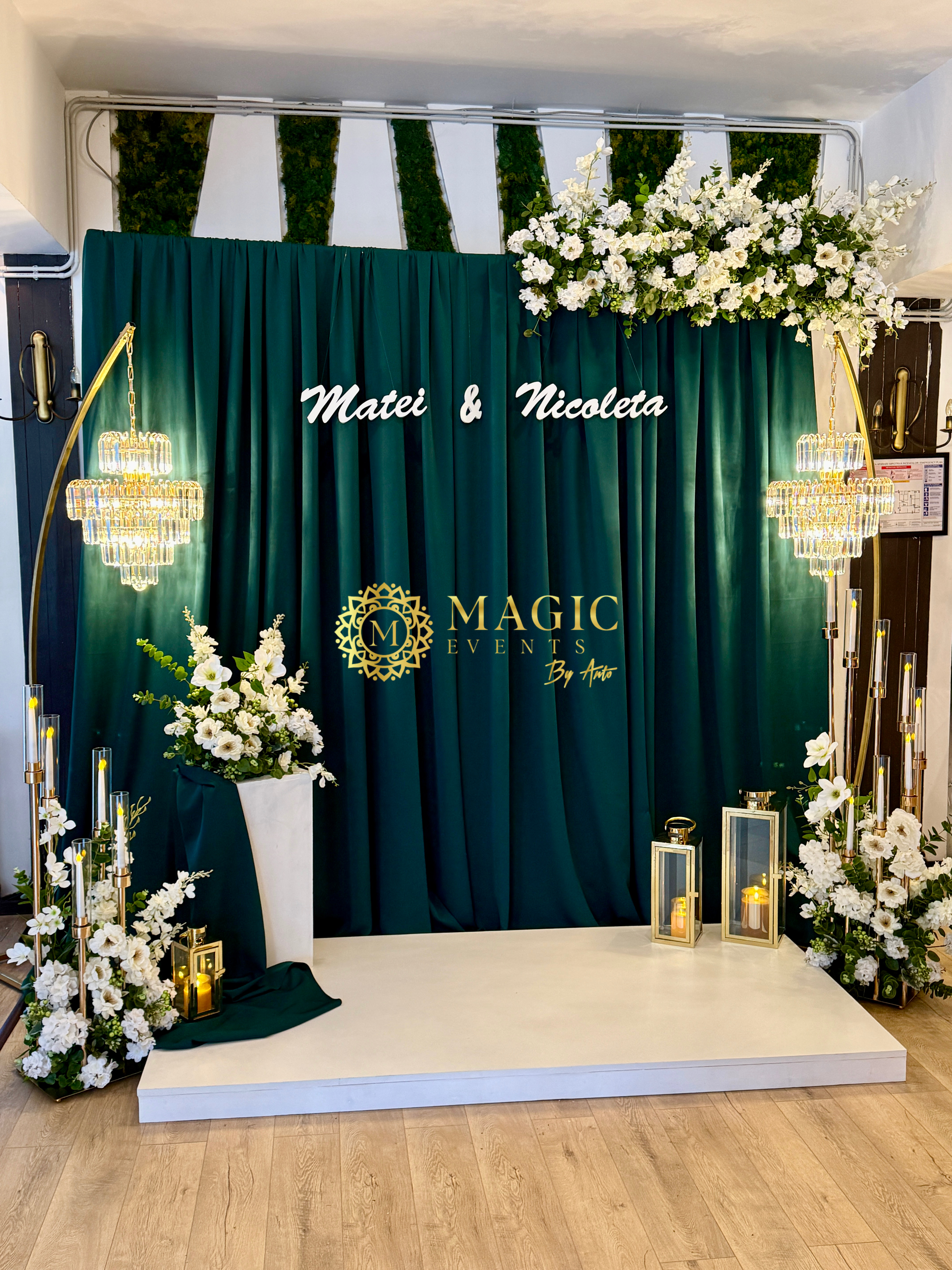 cu drapaje verzi, accente aurii È™i aranjamente florale albe — un cadru rafinat pentru fotografii memorabile.