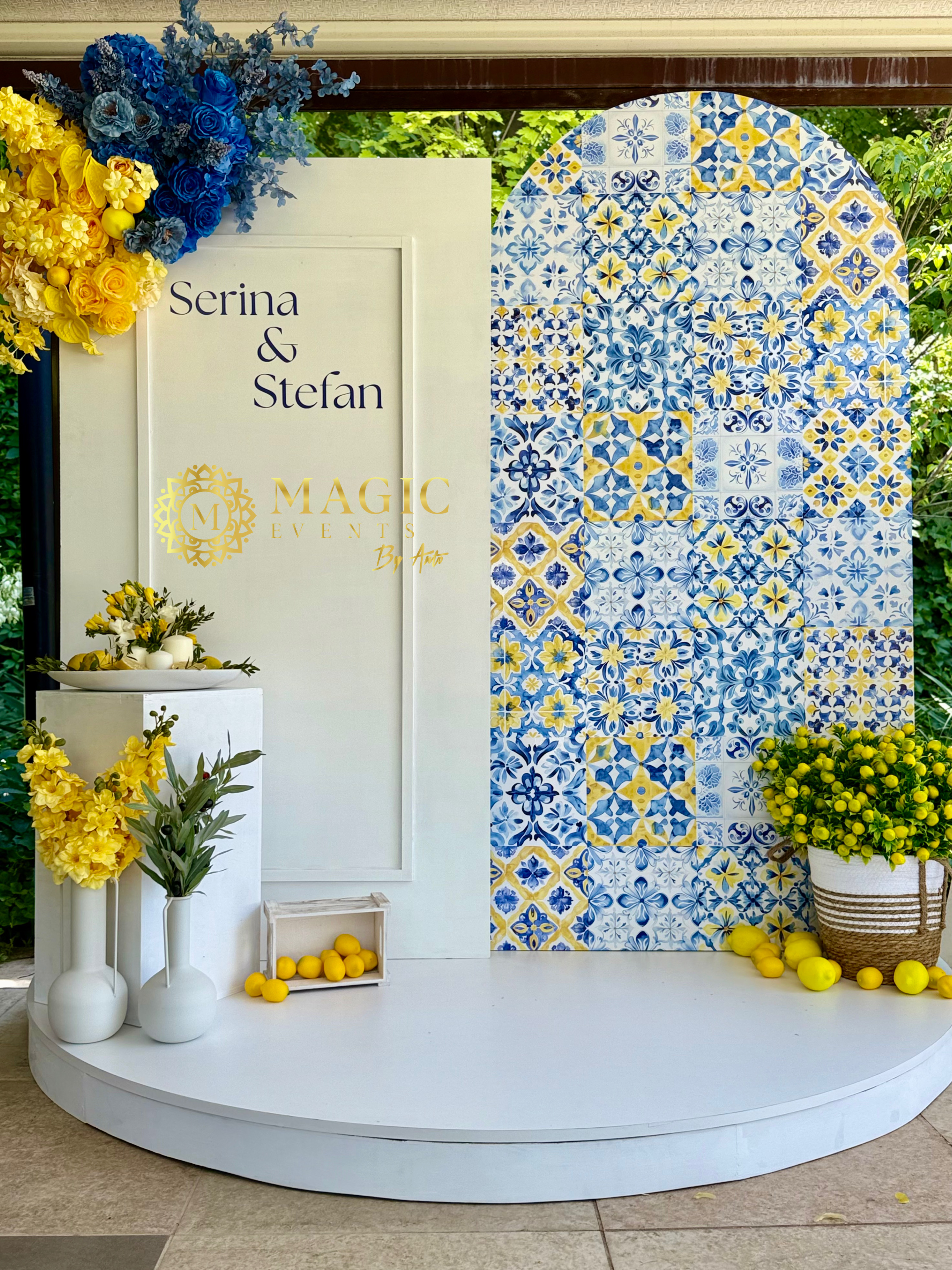 un decor vibrant cu accente albastre și galbene, flori spectaculoase și lămâi proaspete, care aduce atmosfera însorită a Italiei direct în ziua voastră specială.