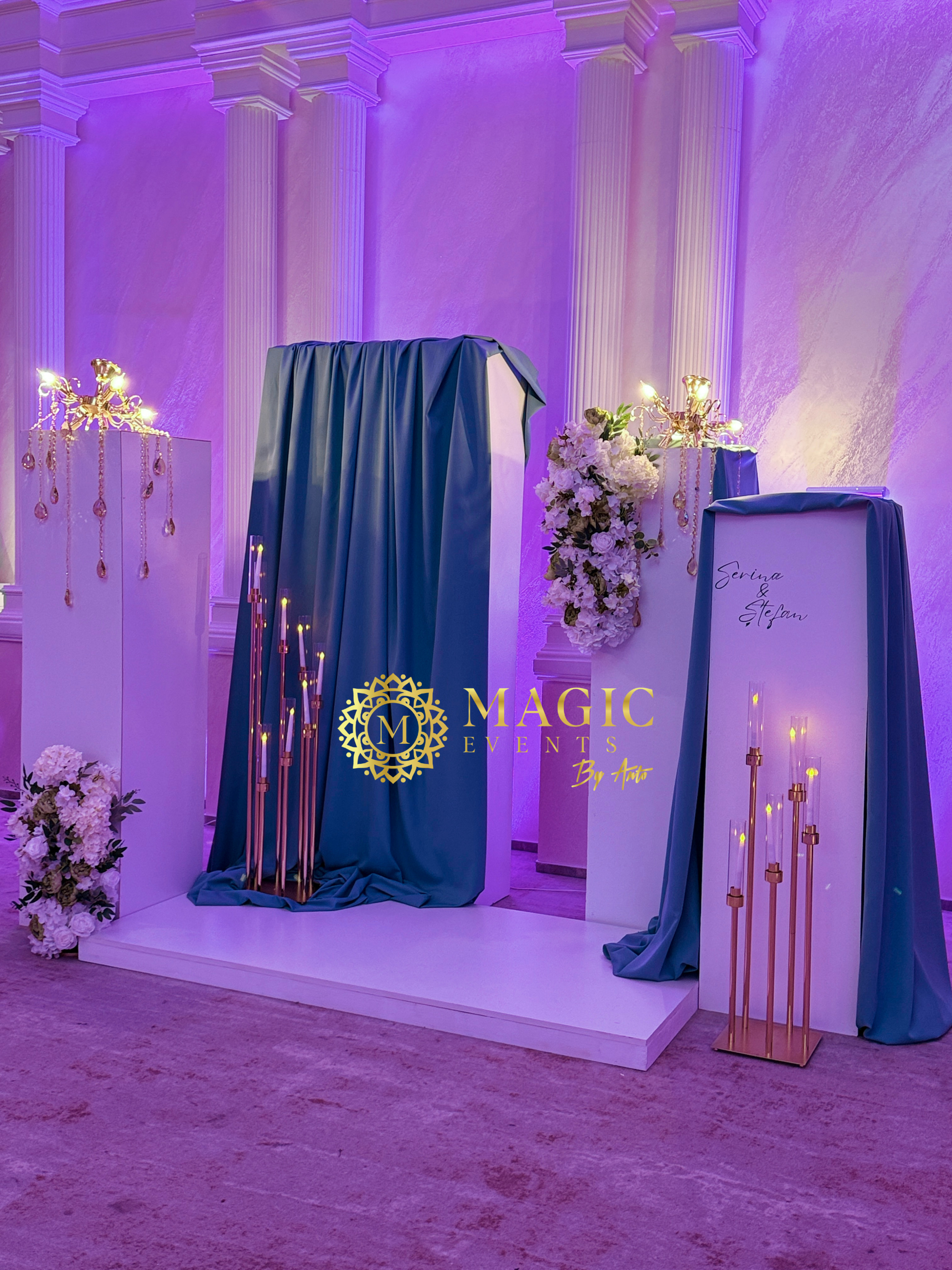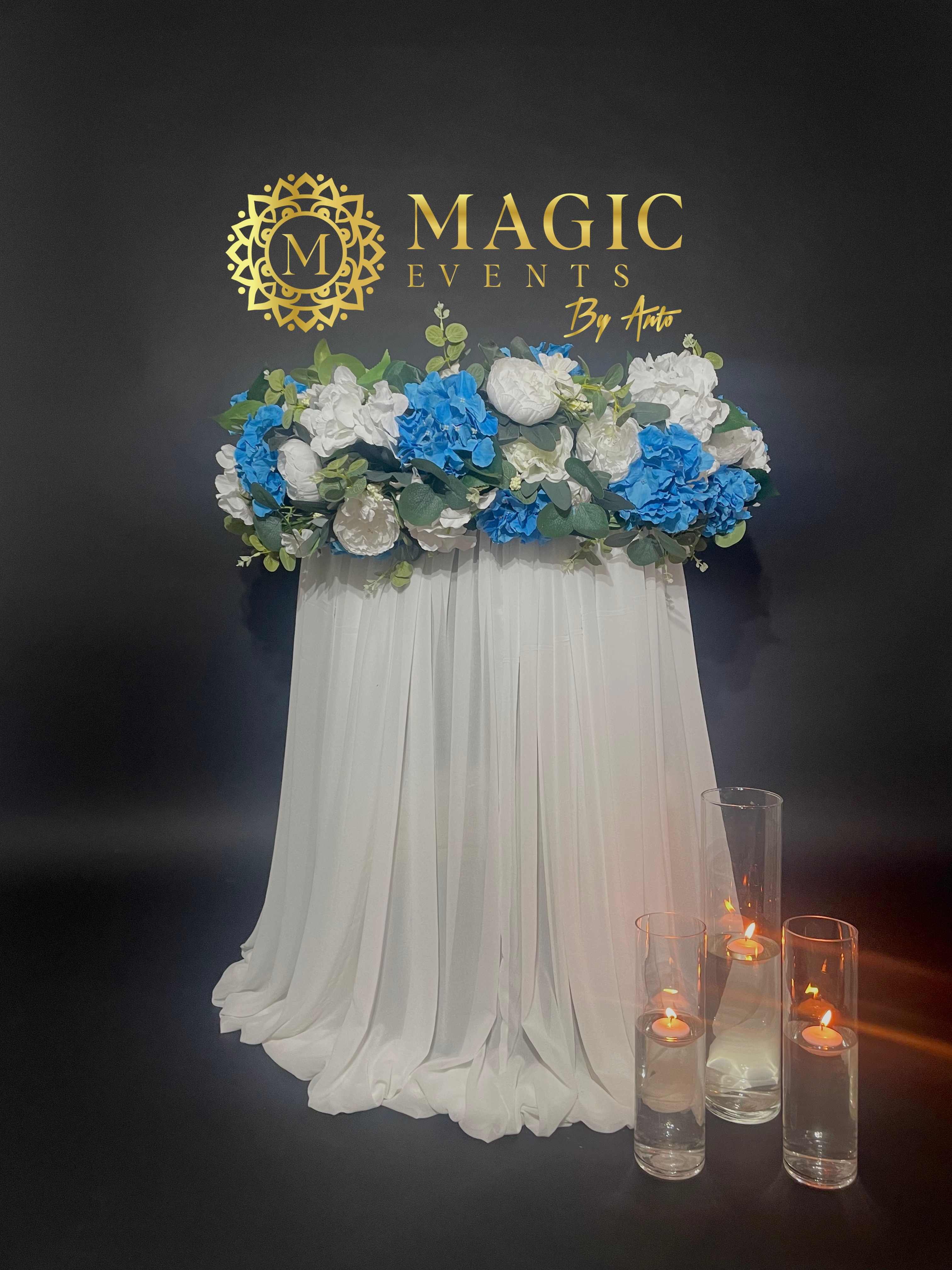 decor rafinat în nuanțe de albastru și alb, completat de aranjamente florale și lumânări elegante, ideal pentru un cadru plin de romantism și stil.