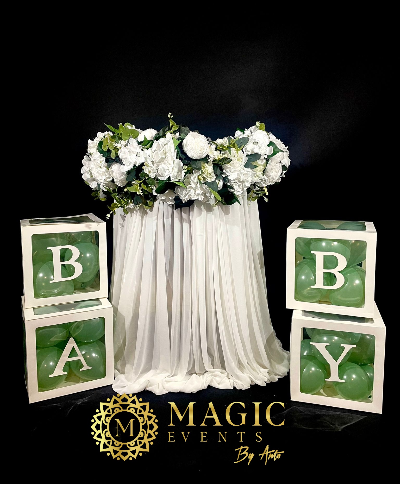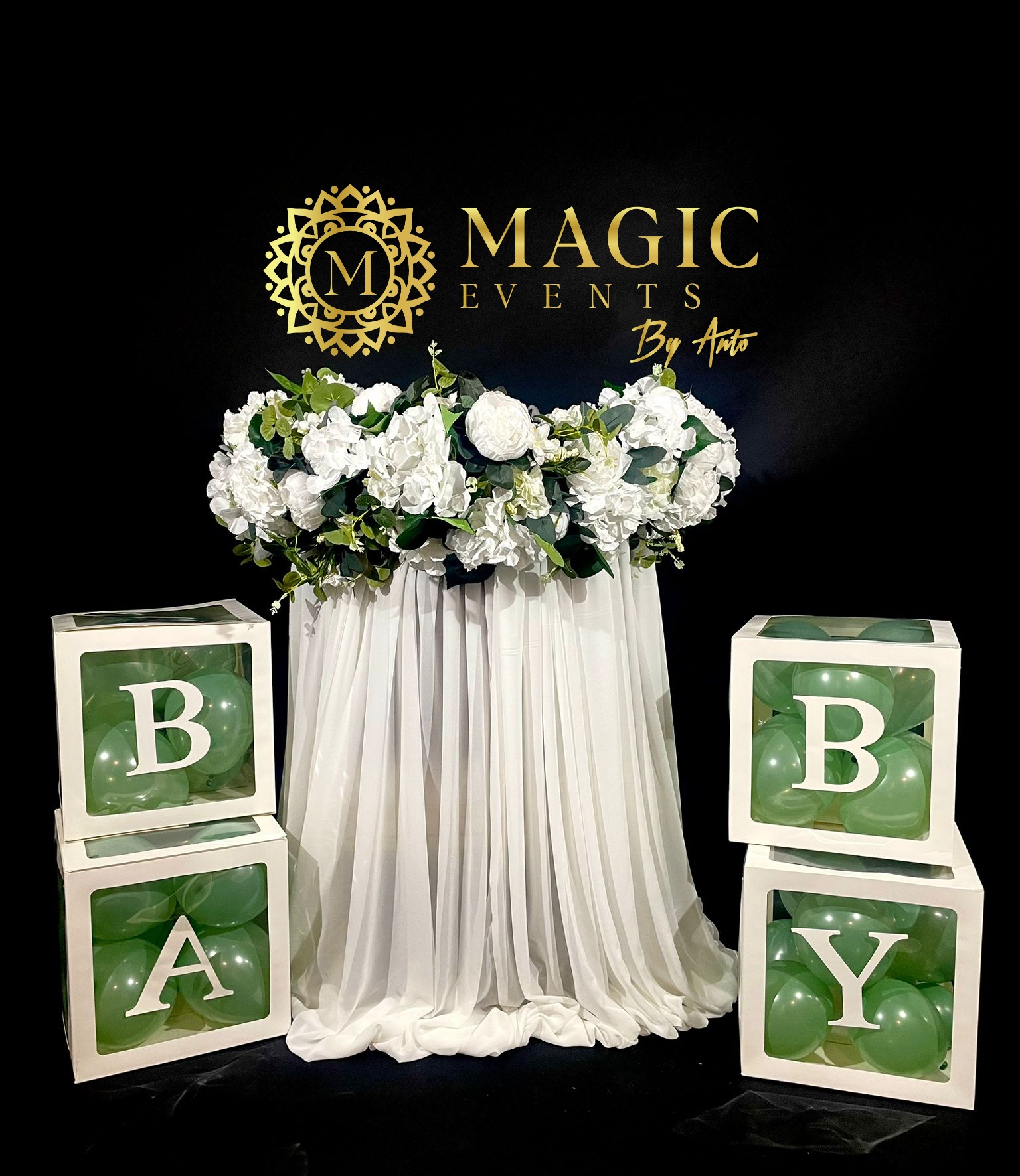 cu arcade negre, flori albe, cilindri cu lumânări plutitoare și palmieri luminați – un cadru elegant și misterios în jurul apei.
