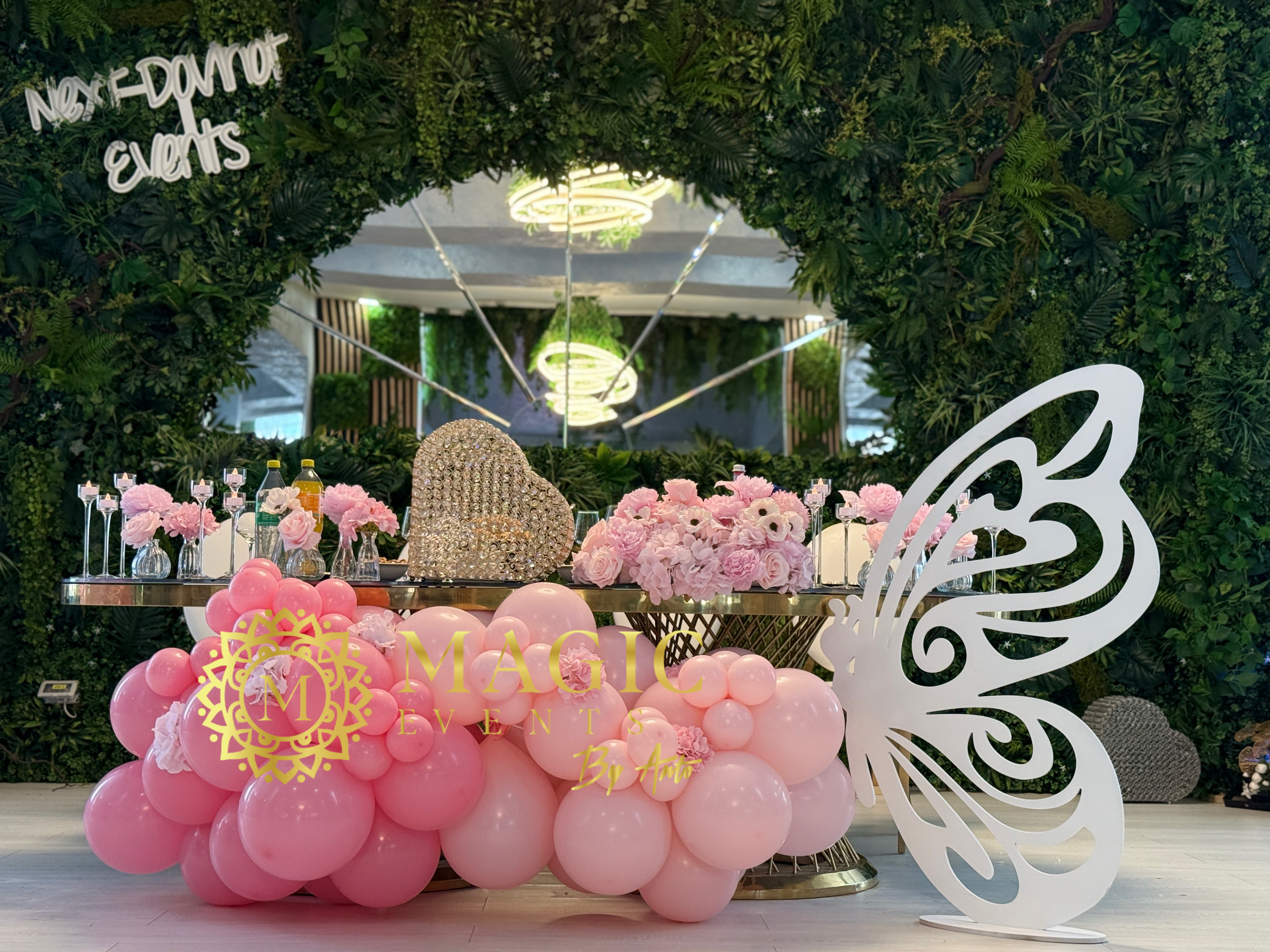 masă elegantă cu baloane roz, flori delicate și accente deosebite, perfectă pentru un botez plin de rafinament!