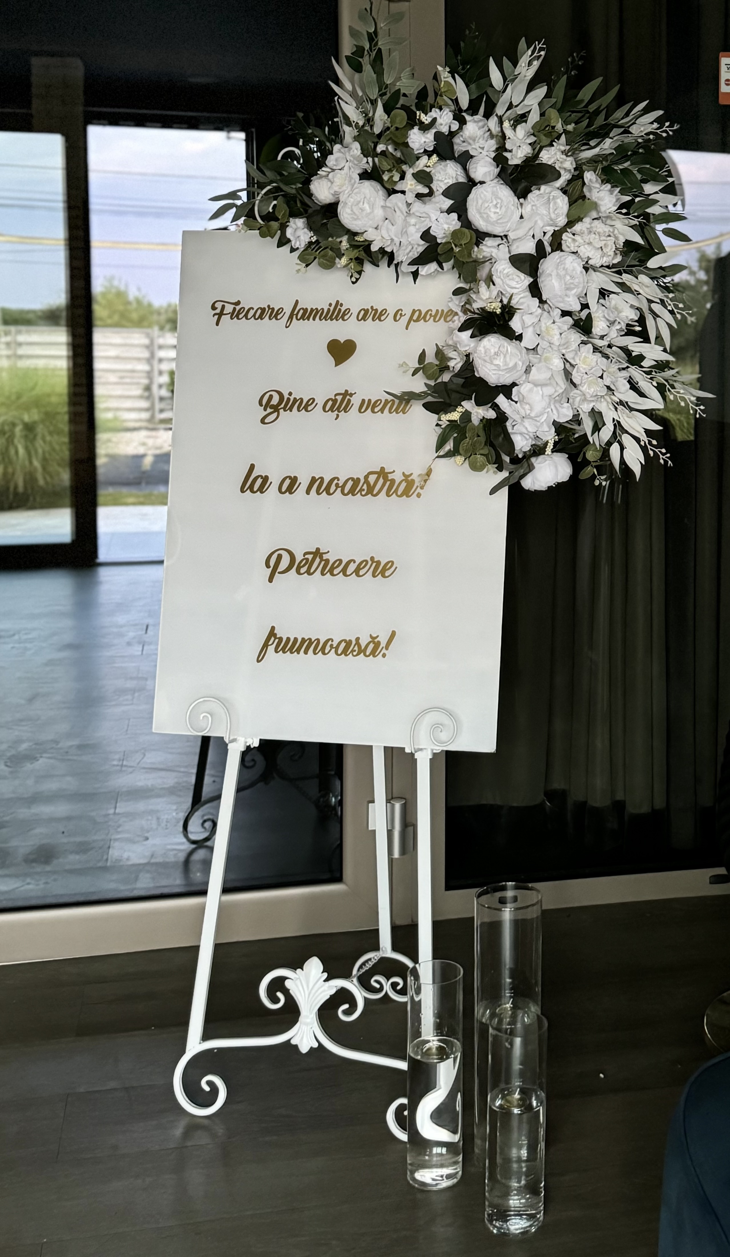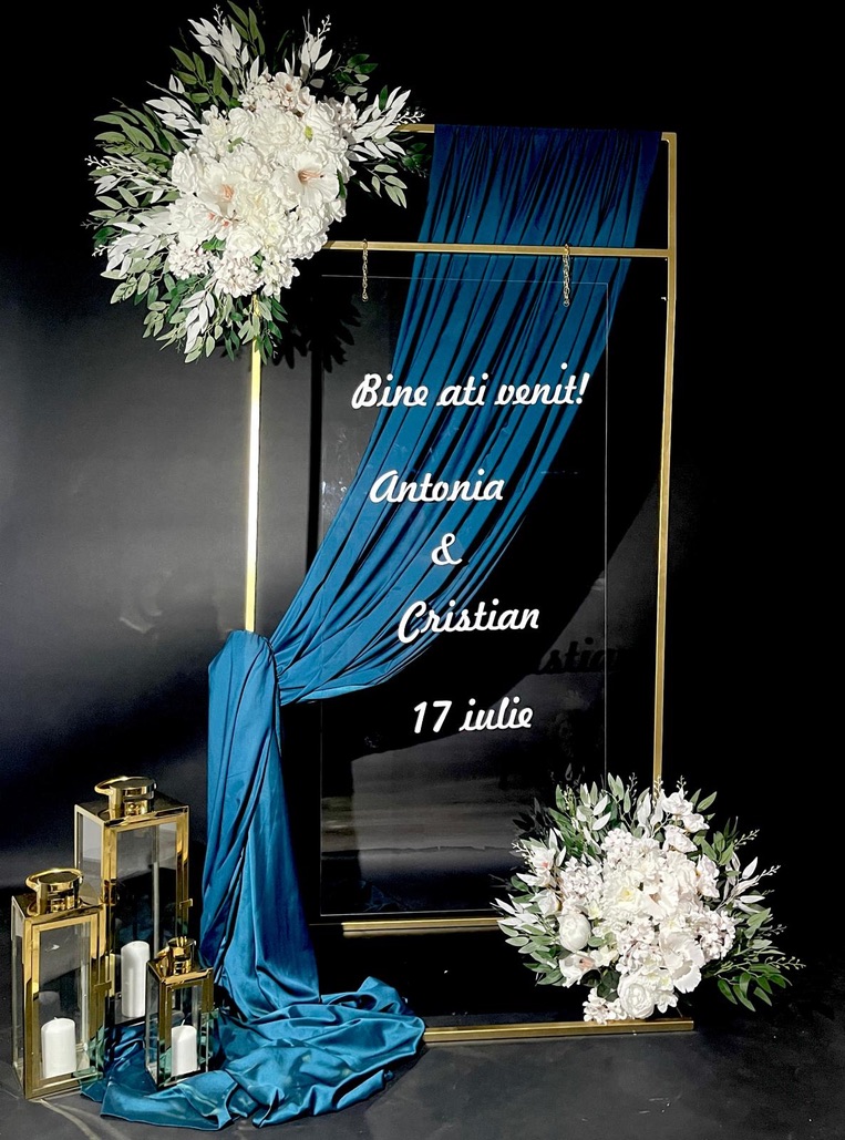 Decor intrare eveniment cu panou metalic auriu si numele mirilor pe plexiglas transparent.