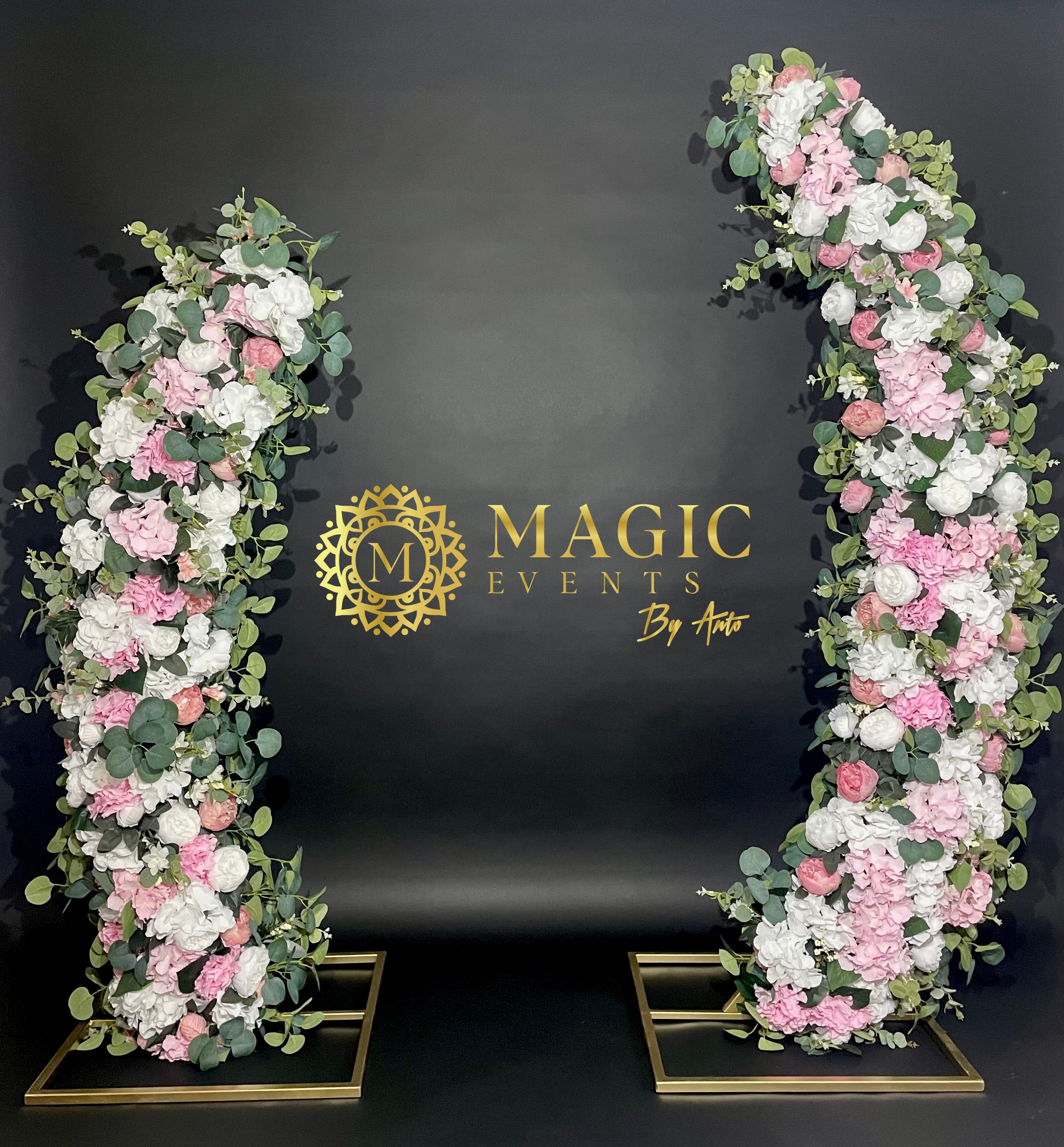Panouri pentru intrarea in biserica/primarie/local in forma de semiluna, decorate cu flori alb-roz.